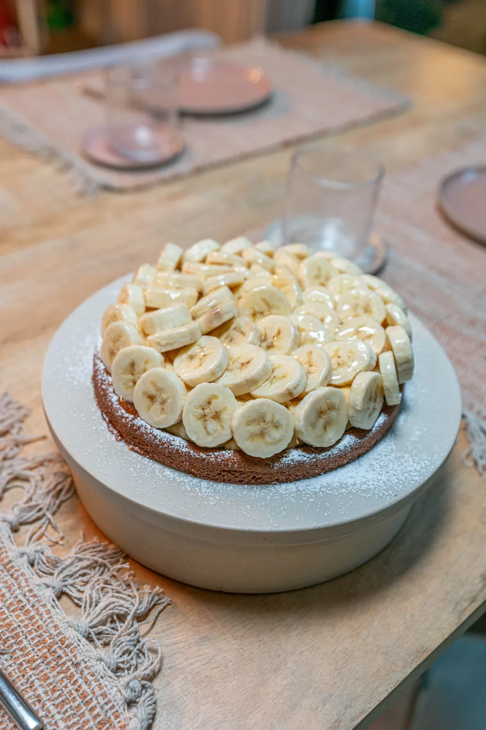 Vul de taartbodem met 2 lagen van de opgesteven mousse en vul op met stukjes banaan. Smeer een dun laagje gelfix op de banaan voor een glanzende effect en om ervoor te zorgen dat de banaan niet uitslaat. Werk af met bloemsuiker.