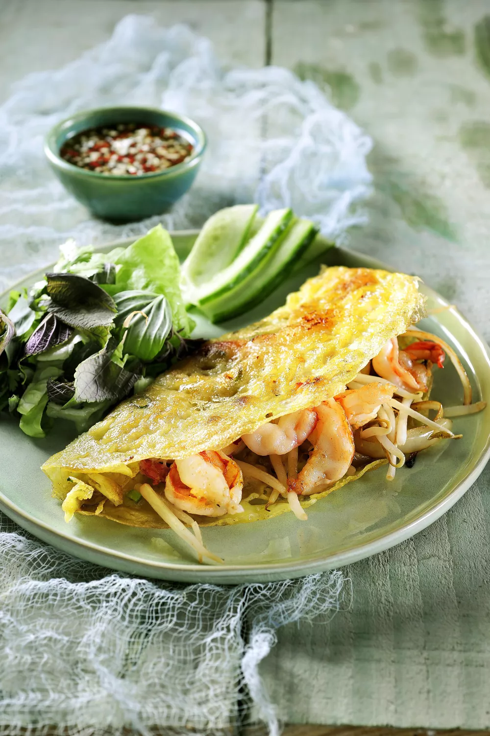 Banh xeo is een krokante Vietnamese pannenkoek van rijstmeel en kurkuma, gevuld met sappige scampi’s, frisse sojascheuten en lente-uitjes. Het snelle bakproces geeft een knapperige textuur, terwijl een pittige vinaigrette van limoen en vissaus met verse kruiden zorgt voor frisse, zoute en lichtzoete tonen. Perfect als zomerse lunch of shared streetfood bij een borrel, en heerlijk om in rijstpapier met koriander en basilicum op te rollen.