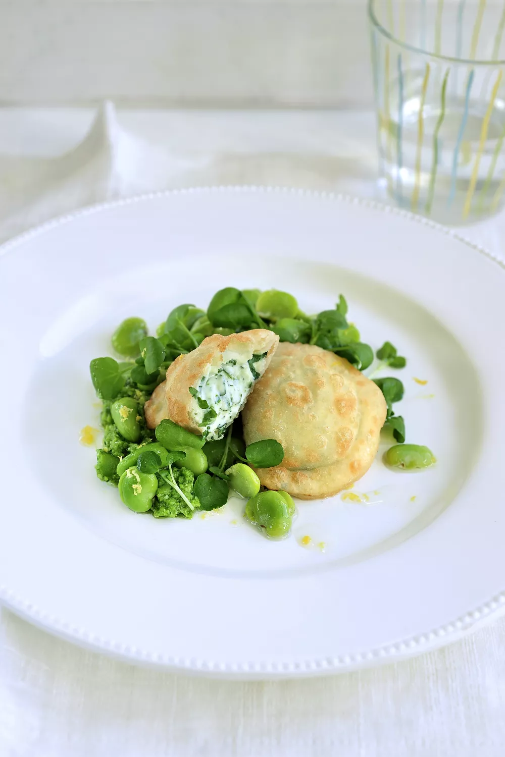 Barbagiuan van ricotta met hummus van tuinbonen