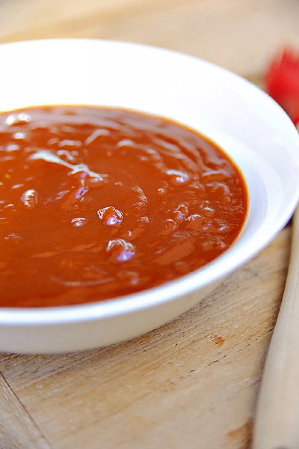 Meng alle ingrediënten en breng aan de kook. Laat ca. 20 min. op een zacht vuur pruttelen tot de saus ingekookt is. Pureer de barbecuesaus met een staafmixer.