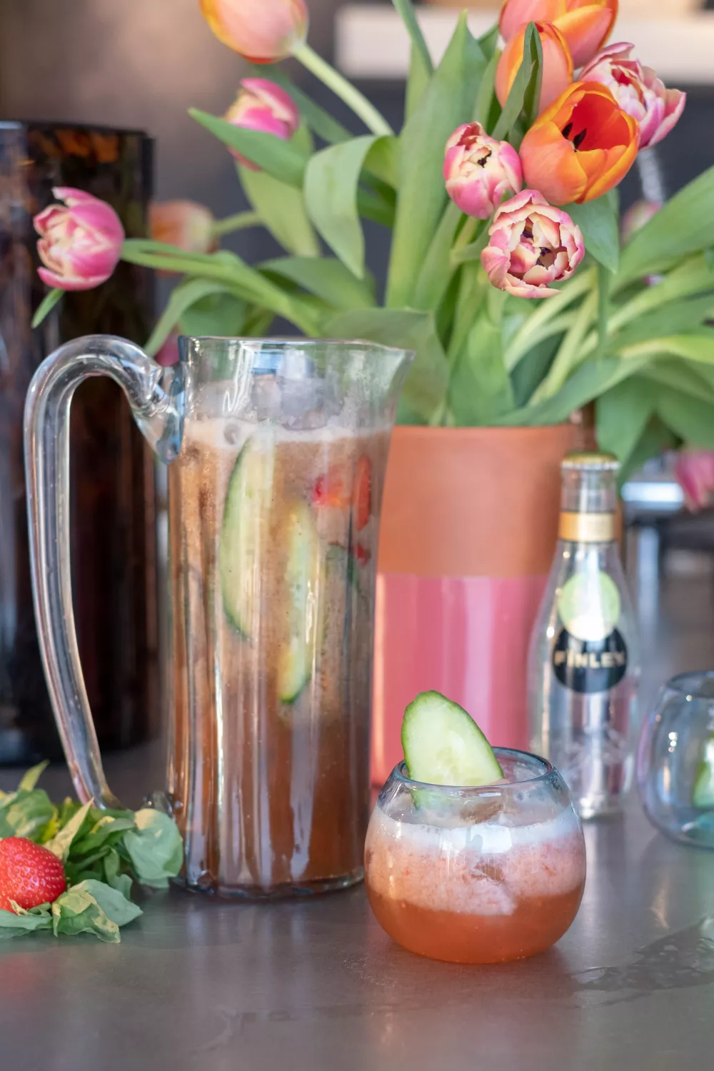 Neem ondertussen al een grote kan. Doe daarin nog enkele verse aardbeien, enkele schijfjes komkommer en enkele ijsblokjes. Giet de mocktail hier in en top met een flesje komkommer tonic.