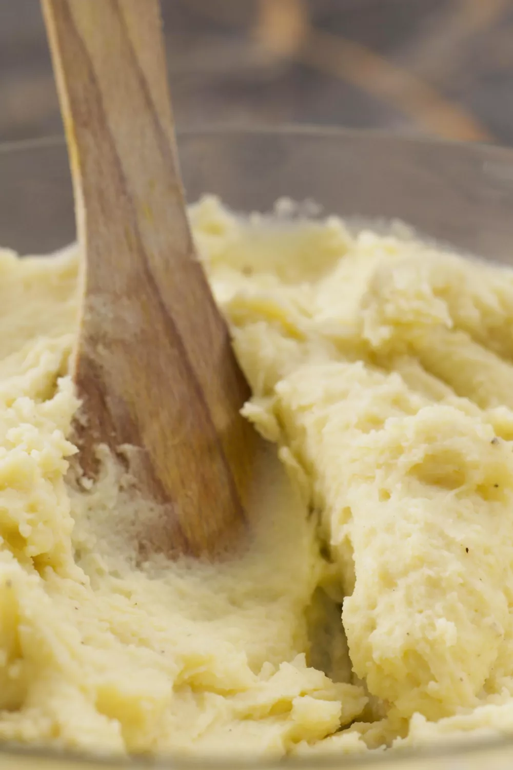 Pureer de warme aardappelen met behulp van een roerzeef. Tip: Heb je die niet, gebruik dan gerust een aardappelstamper, maar nooit een mixer. Zeef het roommengsel, giet het over de aardappelpuree en roer. Voeg in delen blokjes koude boter toe en meng ze door de puree. Kruid de puree met wat (grof) zout en zwarte peper.