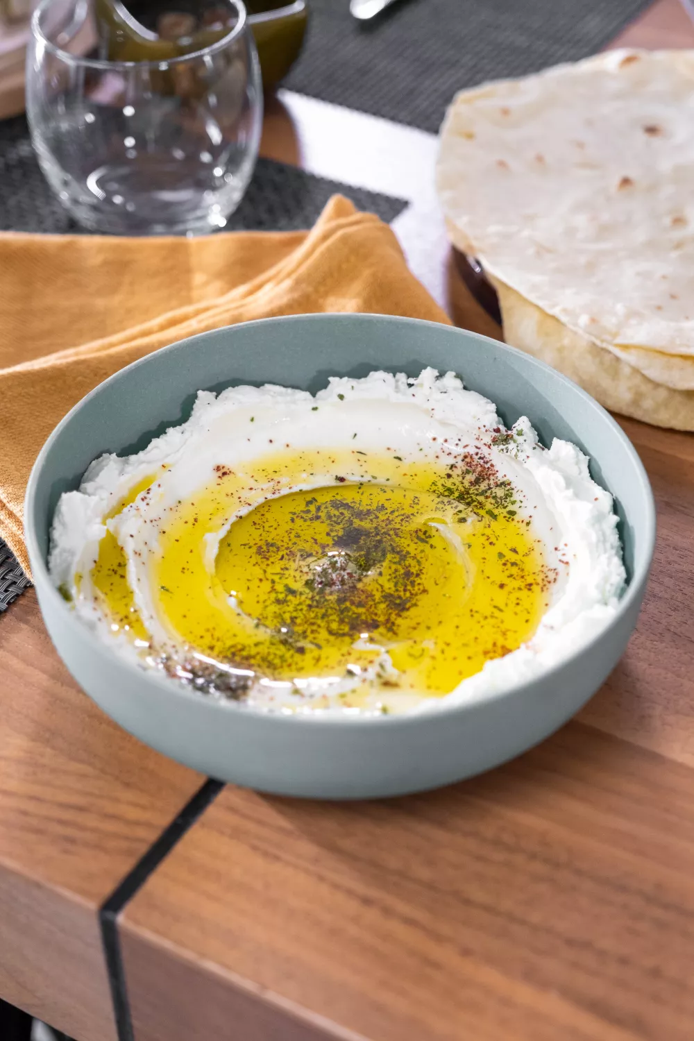 Romige labneh van volle yoghurt met geraspte look, munt en sumac, een frisse mediterrane dip die na enkele uren uitlekken heerlijk stevig wordt. Het eenvoudige uitlekproces en een goede olijfolie maken er een smeuïge spread van, perfect als borrelhap, bij gegrilde groenten of op vers brood. Ideaal voor vroege zomeravonden, lichte lunches of als smaakmaker bij een mezze.