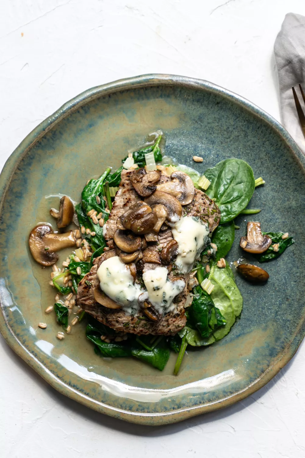 Deze robuuste bavette met gesmolten blauwe kaas op een romige speltrisotto combineert mals rundsvlees met aardse champignons, verse spinazie en rozemarijn en tijm. De spelt wordt risotto-gewijs gegaard met witte wijn en bouillon, terwijl de bavette kort wordt aangebakken en even onder de grill gaat voor een krokante korst. Perfect als verwarmend weekenddiner of gezellig herfst- of winteretentje.