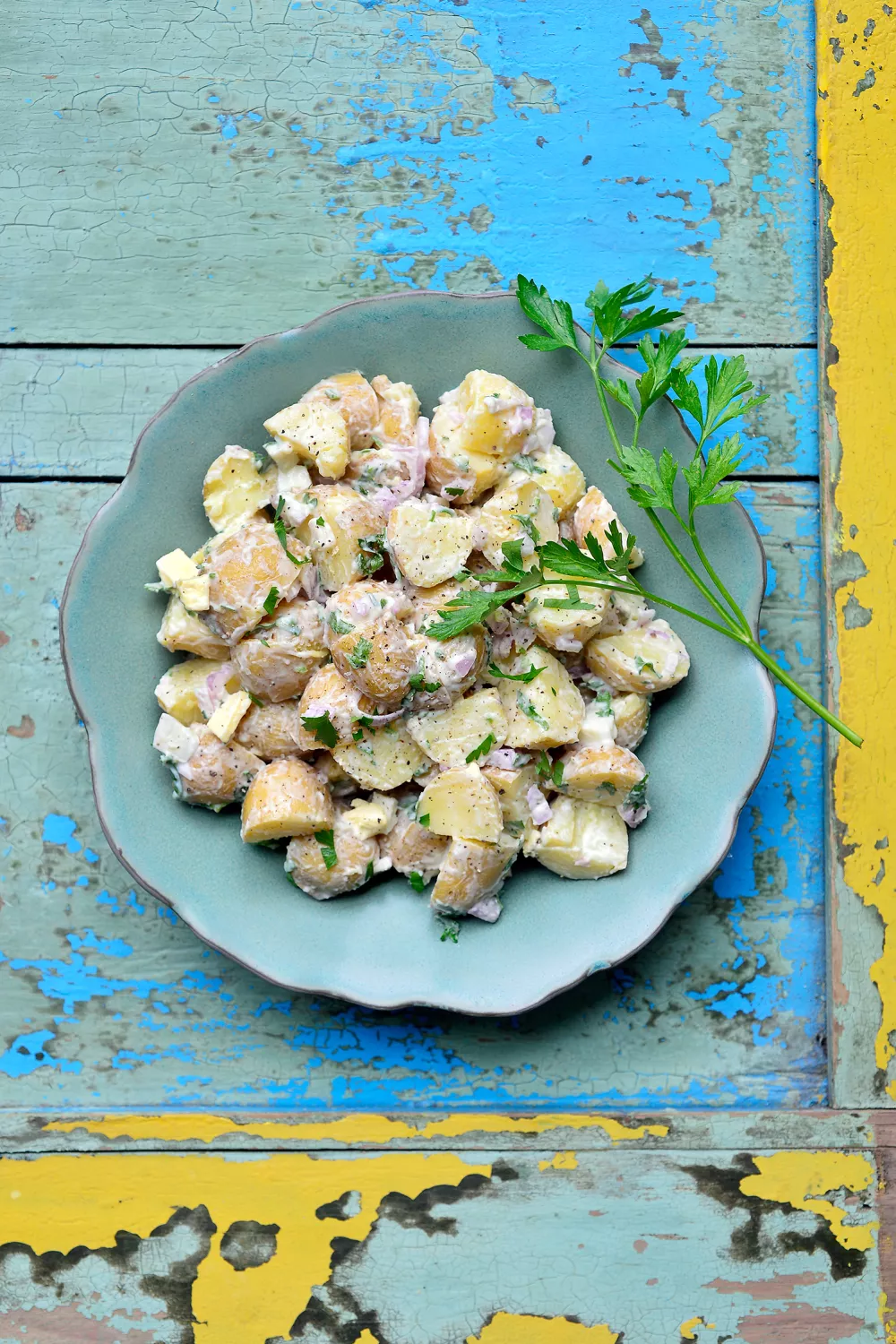 Licht romige aardappelsalade met zachte stukjes gekookt ei, frisse peterselie en knapperige sjalotjes is het perfecte bijgerecht voor een zomerse barbecue of picknick. Krielaardappelen worden kort gekookt en gemengd met mayonaise, peper en zout voor een eenvoudige, klassieke salade die snel op tafel staat.
