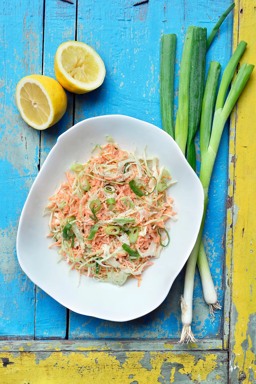 Deze frisse coleslaw combineert knapperige witte kool en geraspte wortel met pittige lente-ui en een romige dressing van mayonaise, witte wijnazijn, suiker en citroensap. Met een snelle snede op de mandoline en raspen van de wortel heb je in een handomdraai een zomers bijgerecht dat uitstekend past bij barbecue, picknick of lichte lunch. De combinatie van zoet en zuur zorgt voor perfecte balans.