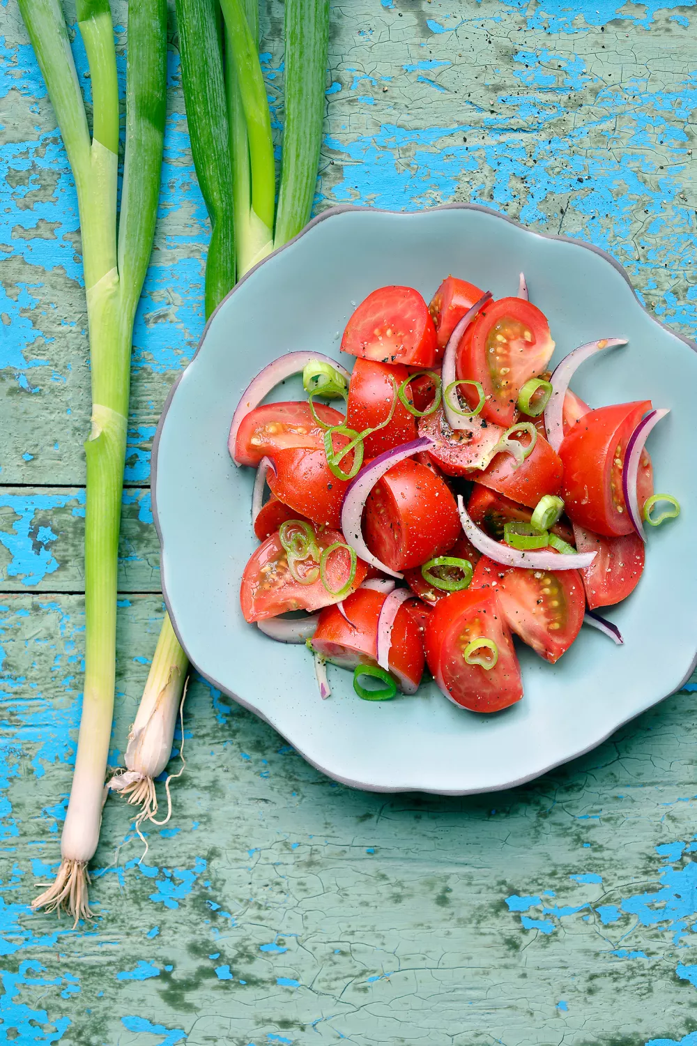 Een kleurrijke tomatensalade met rijpe tomaten, knapperige rode ui en frisse lente-ui, op smaak gebracht met olijfolie, rode wijnazijn, peper en zout. Deze eenvoudige snelle salade is ideaal als bijgerecht bij de barbecue of als zomerse lunch. Snijden en mengen is alles wat je nodig hebt voor een frisse, smaakvolle klassieker.