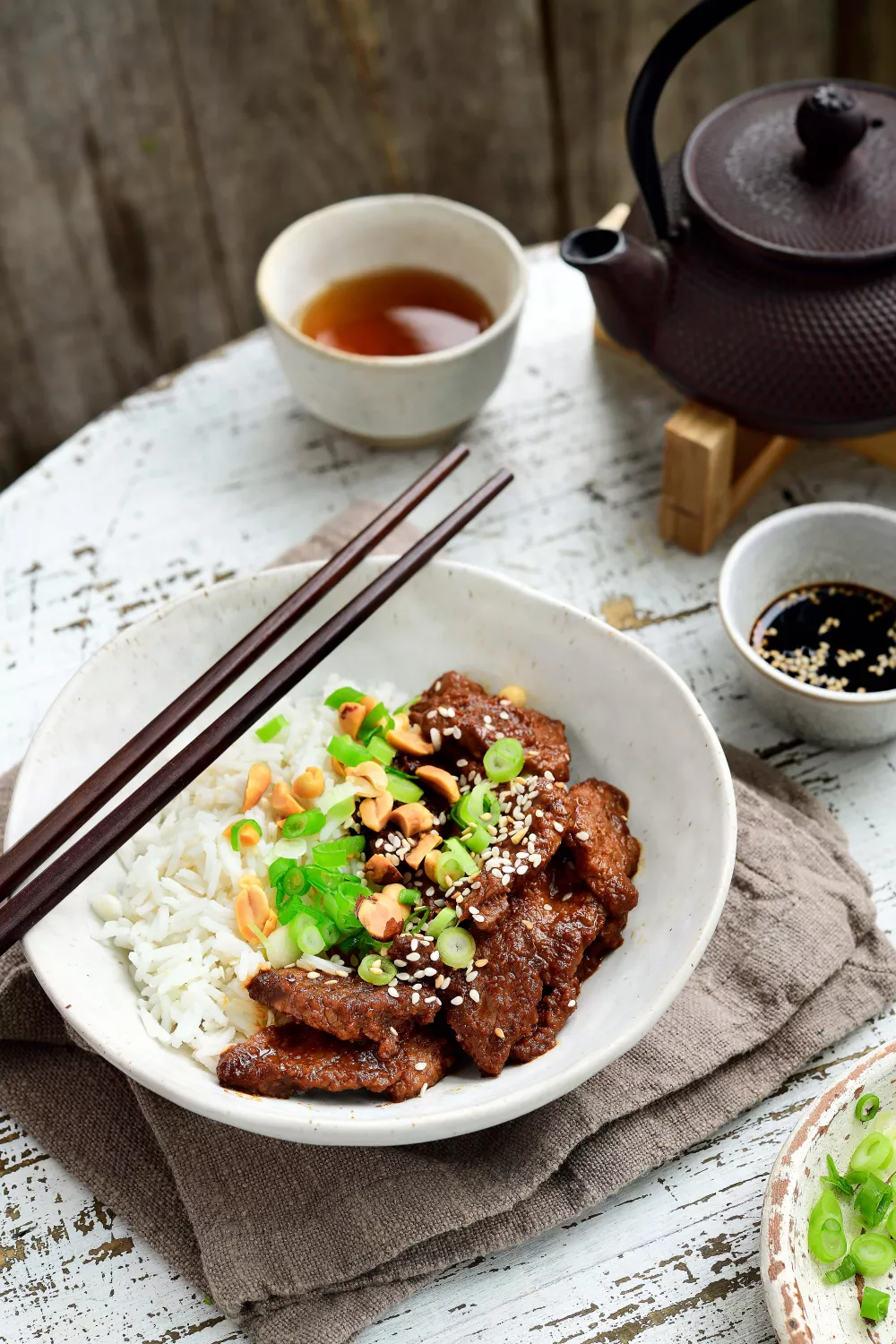 Serveer het vlees met de gekookte rijst. Werk af met lente-ui, sesam en pinda.