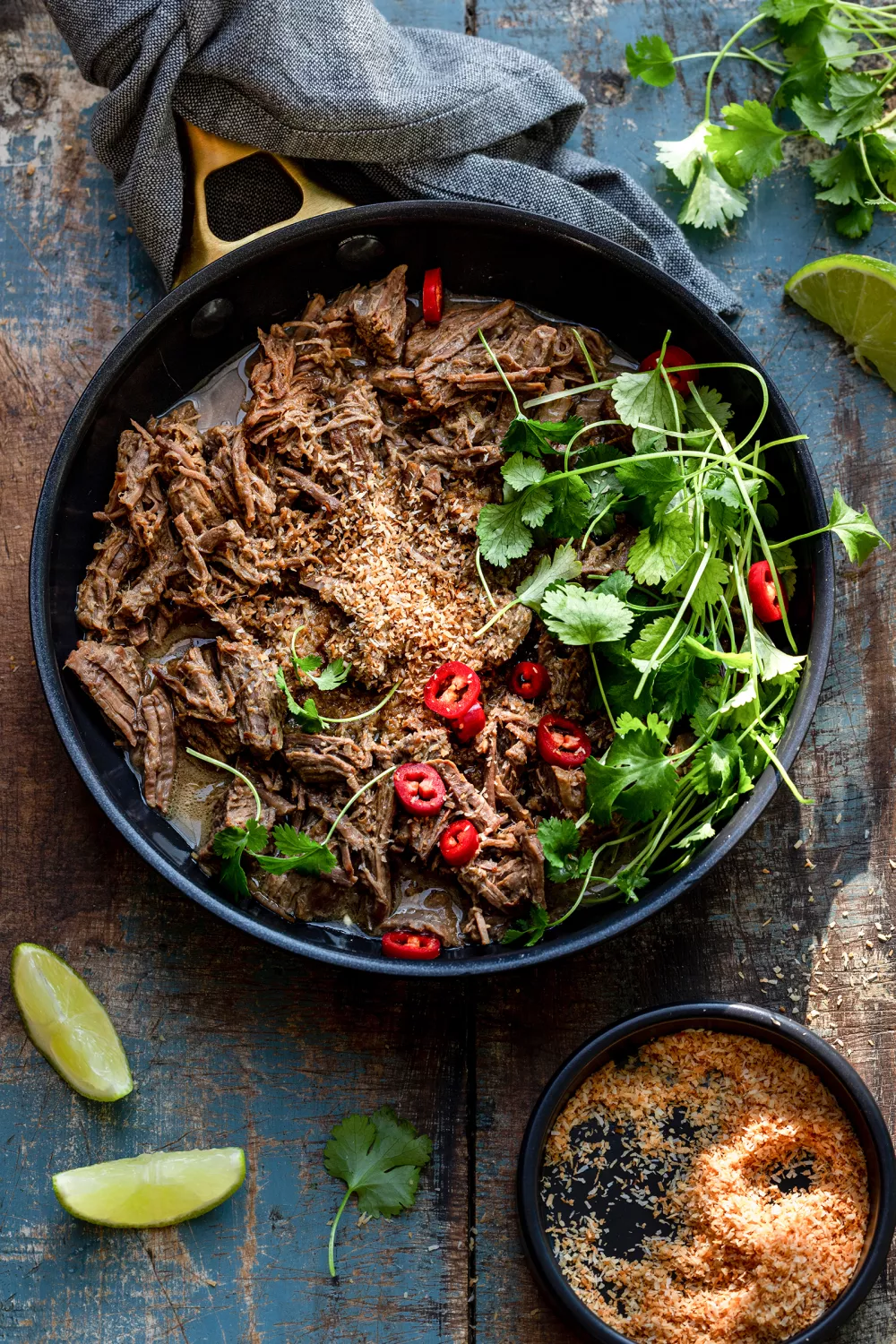 Verdeel de beef rendang over de borden en werk af met geroosterde kokosnoot en verse koriander. Serveer met rijst.