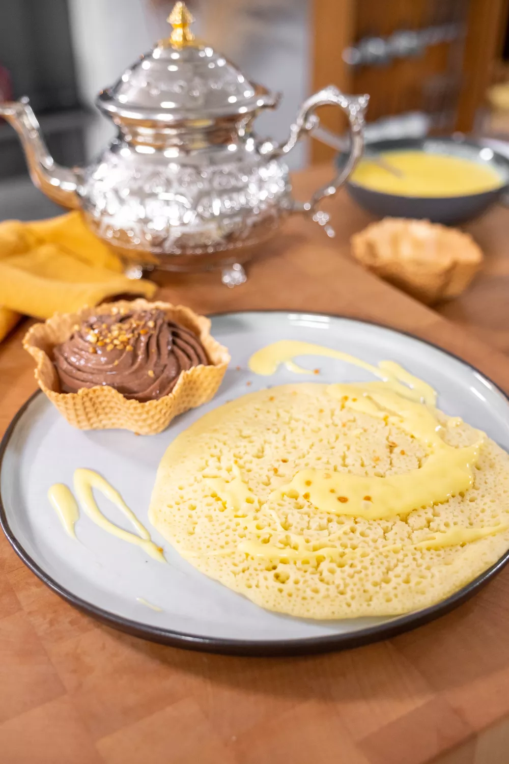 Luchtige Marokkaanse beghrir van fijn griesmeel en bloem, geserveerd met romig chocolade-tahin softijs op basis van bevroren banaan en cacao en een rijke gele puddingroom. Het beslag mix je kort in de blender en laat je rijzen zodat de pannenkoeken hun karakteristieke gaatjes krijgen, waarna je ze zachtjes bakt in een warme pan. Perfect als zomerse brunch of feestelijk dessert, afgemaakt met een knapperige touch van gemalen nougatine.