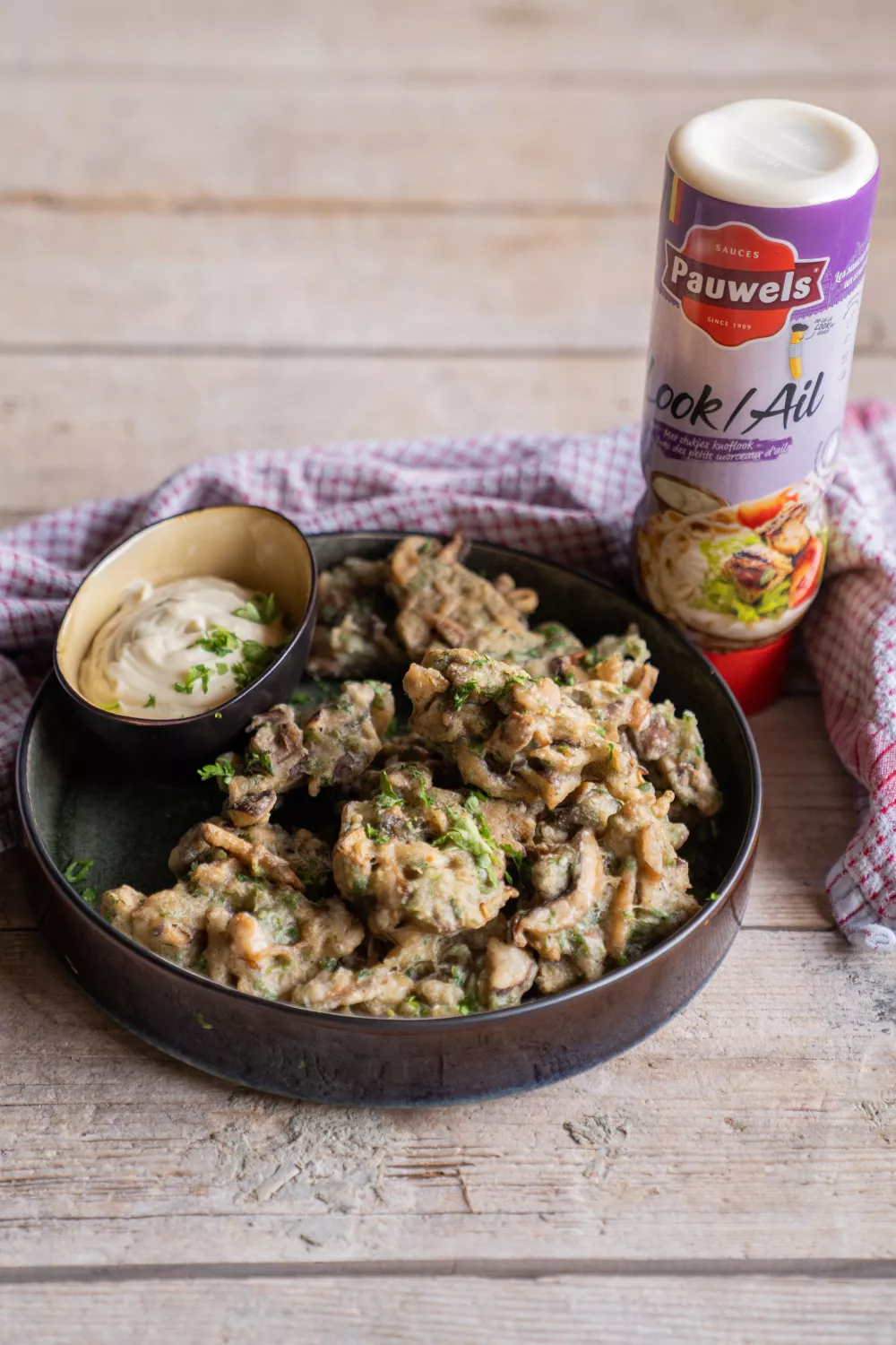 Werk de champignonbeignets af met fijngehakte peterselie en serveer met een potje looksaus.