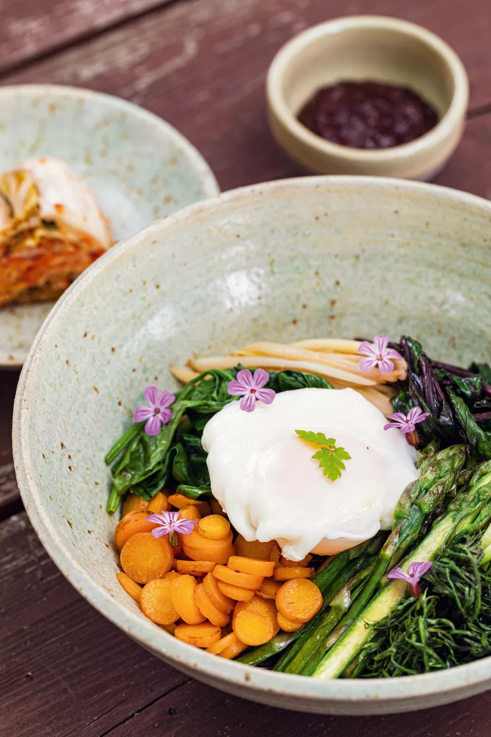 Bibimbap is een kleurrijke Koreaanse rijstbowl met kleefrijst, geroerbakte groenten, een zacht ei en een pittige sojasaus met gochugaru. Met asperges, spinazie en wortelloof krijgt dit lenteachtig gerecht frisse texturen en hartige umami. Roerbakken en kort blancheren zorgen voor mooie bite, waardoor deze gezonde, snelle bowl perfect is voor een doordeweekse maaltijd of een feestelijke lunch.