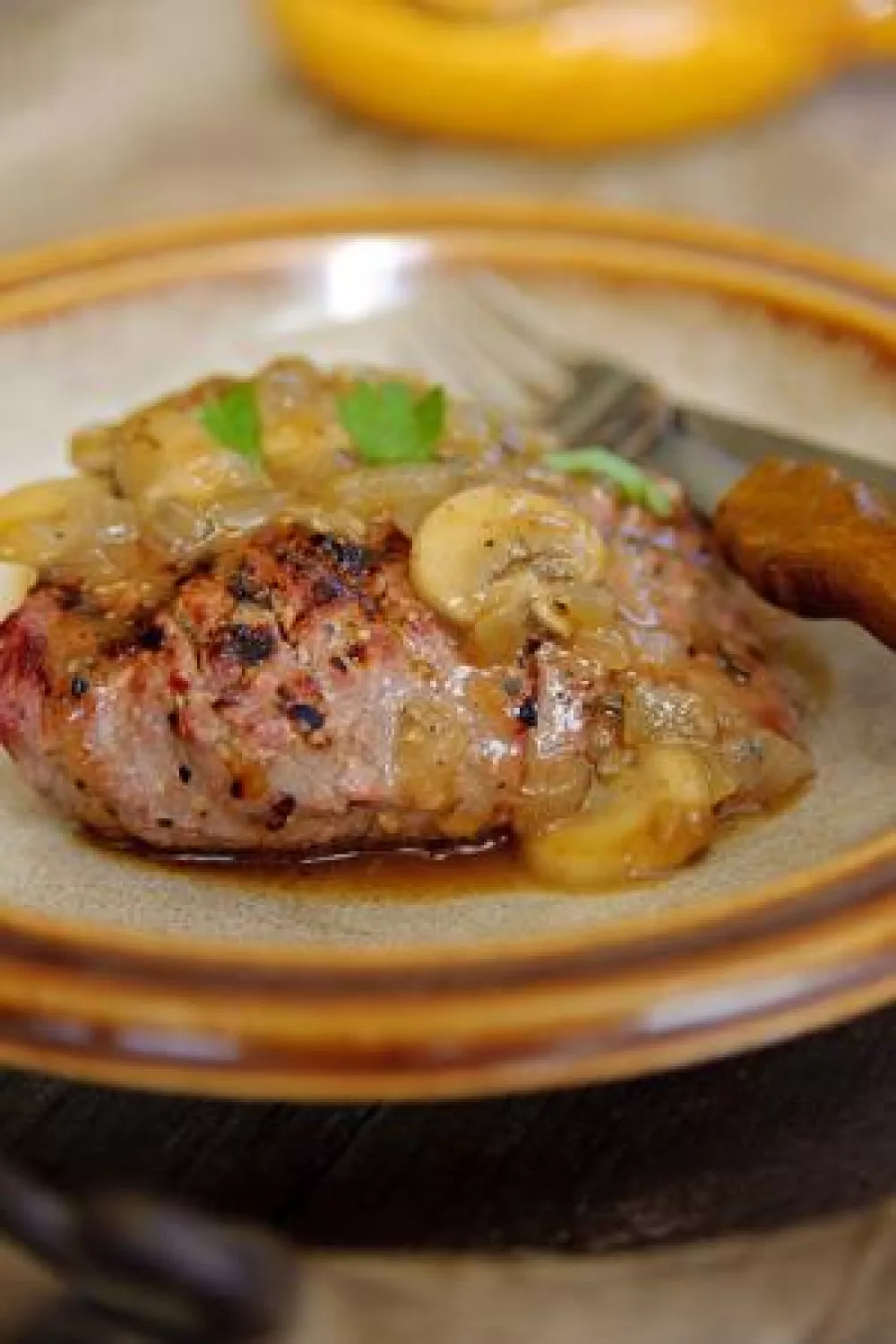 Zin in een brasserieklassieker als hoofdgerecht? Sappige biefstuk met zijdezachte zoete uisaus, aangefruite ui en champignons krijgt diepte door bloem, runderbouillon, Worcestersaus, rode wijnazijn, bruine suiker en tijm die samen rustig pruttelen. Grill de steak kort in de grillpan voor een mooie korst en serveer met gebakken aardappels en salade. Comfortfood voor een doordeweekse avond, herfstig weekend of intiem diner.