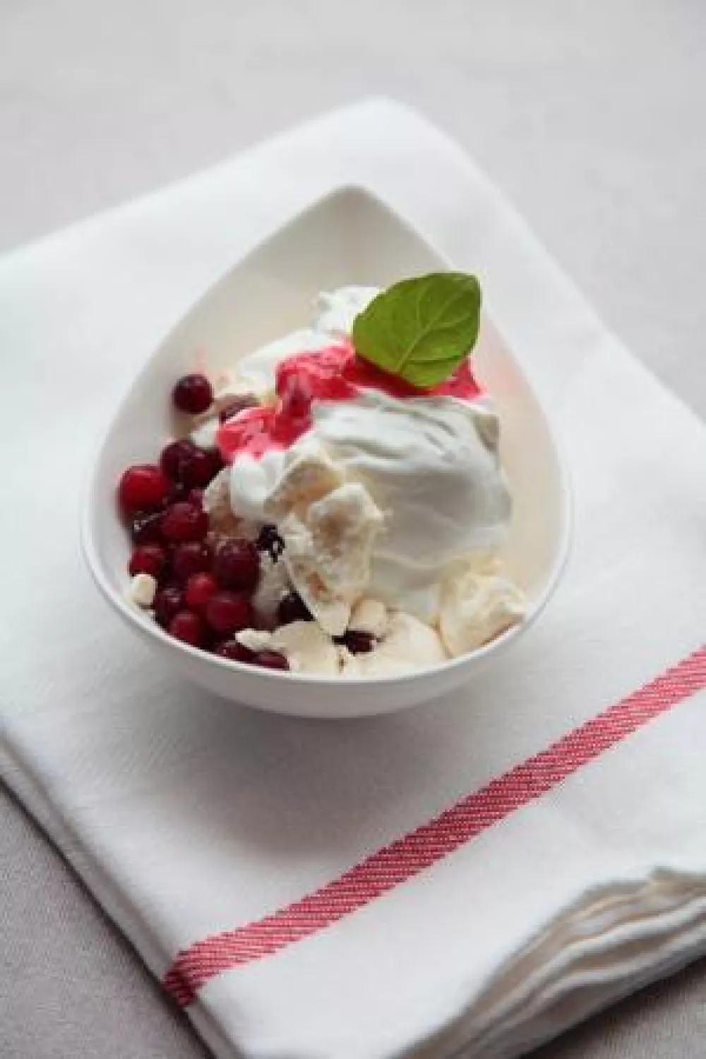 Giet wat coulis onderaan in het bord. Breek de meringue in grote stukken en leg in het bord. Schep de yoghurt over de meringue. Werk af met rode vruchten.