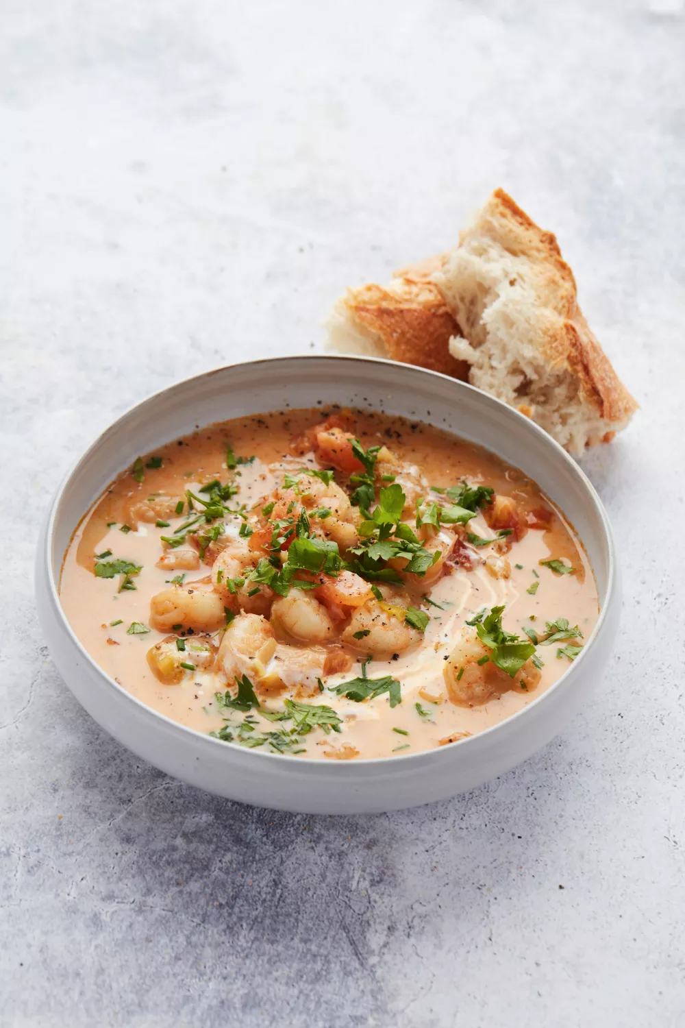 Deze romige bisque met scampi's combineert zachte prei, sappige tomaten en een scheut witte wijn tot een rijke zeevruchtensoep met een fluweelachtige roomtoets. Sjalot en knoflook worden aangebakken en afgeblust met wijn, waarna de bouillon kort suddert met de scampi voor een geconcentreerde smaak. Perfect als elegante starter bij een diner of als hartverwarmende maaltijd op een frisse herfstavond of winteravond, geserveerd met knapperige toast en verse bieslook en peterselie.