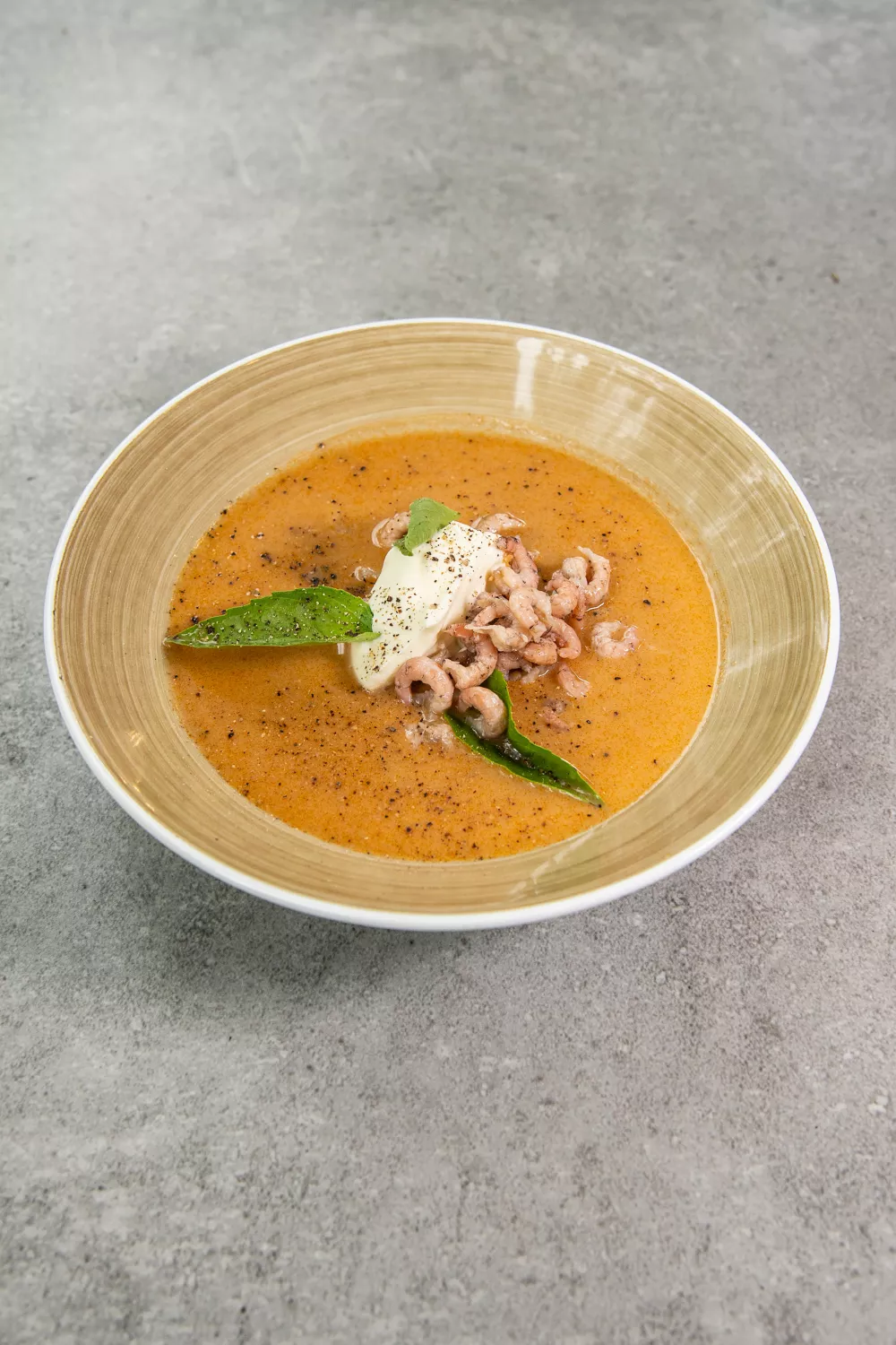Schik in ieder bord een gulle portie gepelde garnalen en schep de soep eroverheen. Laat de garnalen niet meekoken met de soep, want dan worden ze taai en verliezen ze hun fijne smaak. Werk af met kleine blaadjes basilicum.