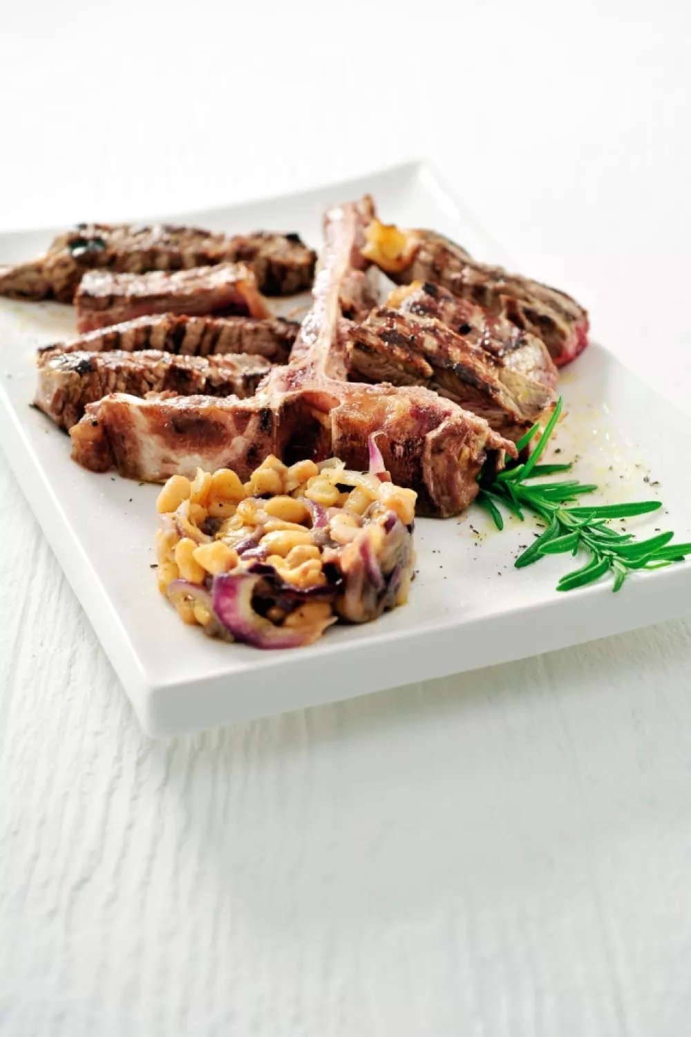 Vul een vormpje met de cannellini, duw goed aan. Verwijder de vorm. Leg 2 stuks filet en 2 stuks entrecote op het bord. Werk af met de ovenaardappeltjes en besprenkel met wat olijfolie, grofgemalen peper en een snuifje van het zoutmengsel. Serveer met een takje rozemarijn.
