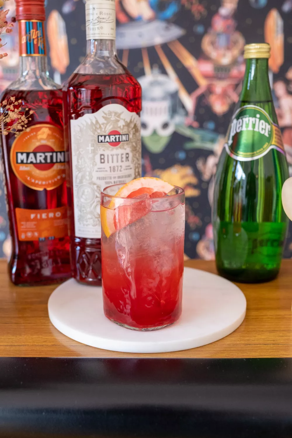 De Bitter Americano is een sprankelende aperitiefcocktail met Martini Fiero, Martini Bitter en vers pompelmoessap, opgefrist met Perrier. Licht bitter en fruitig tegelijk, ideaal voor zomerse borrels of als aperitief bij lichte gerechten. Makkelijk te bereiden in een longdrinkglas: voeg ijs toe, roer kort met een barlepel en garneer met een schijfje pompelmoes.
