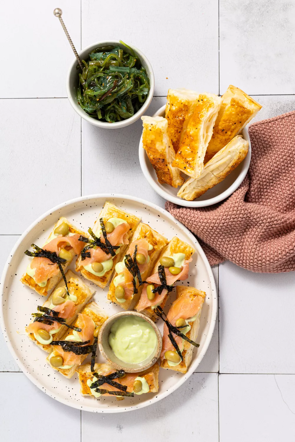 Combineer het beste van twee werelden met dit verrassende bladerdeeghapje sushi style. De knapperige bodem van goudbruin bladerdeeg vormt de perfecte basis voor de hartige combinatie van gerookte zalm, zoute nori en frisse edamame boontjes. Afgetopt met een pittig accent van wasabimayonaise is dit hét ideale hapje voor wie op zoek is naar een originele Aziatische twist op de borrelplank!