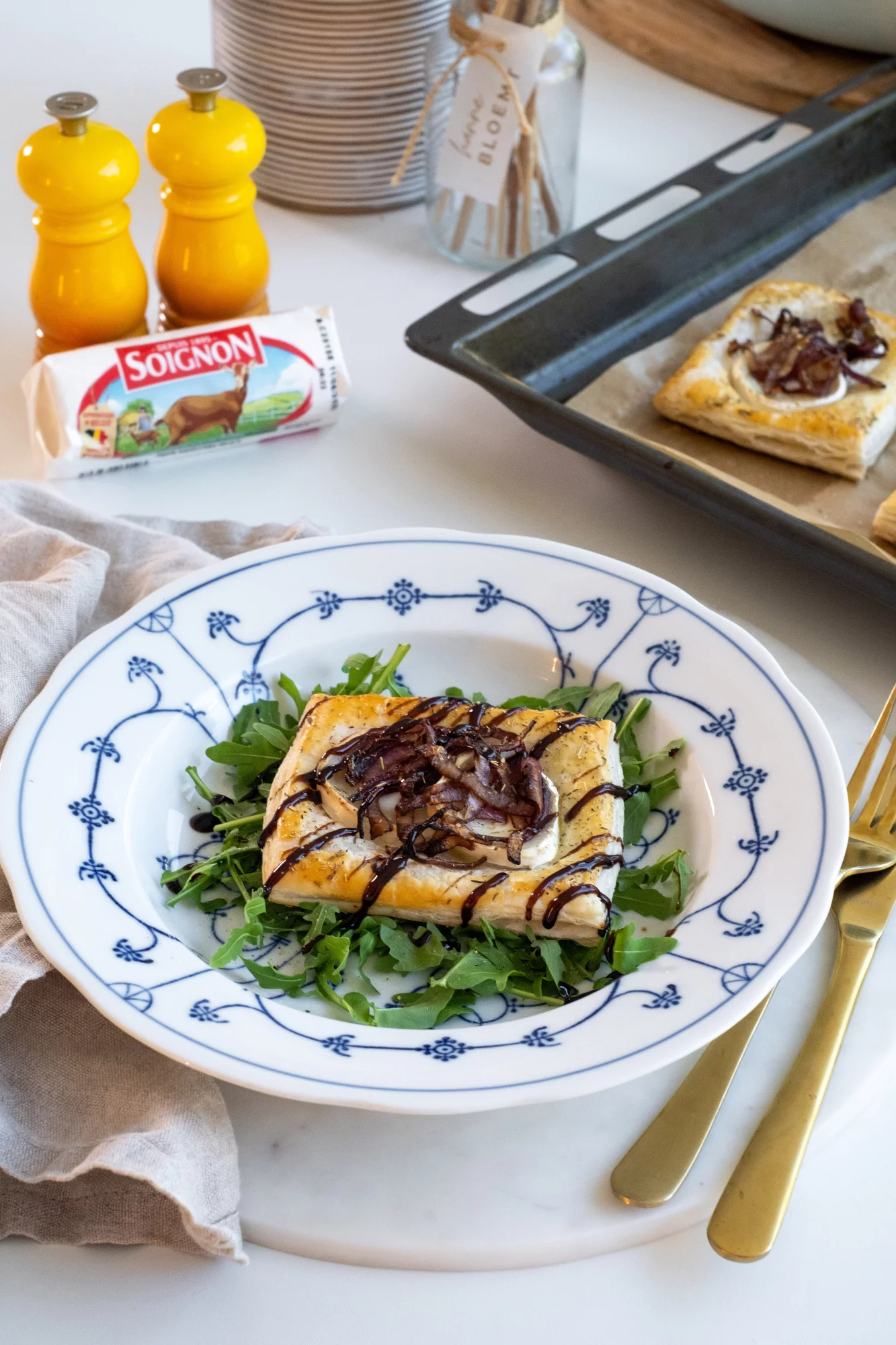 Bladerdeegpakketjes met geitenkaas en gekarameliseerde ui