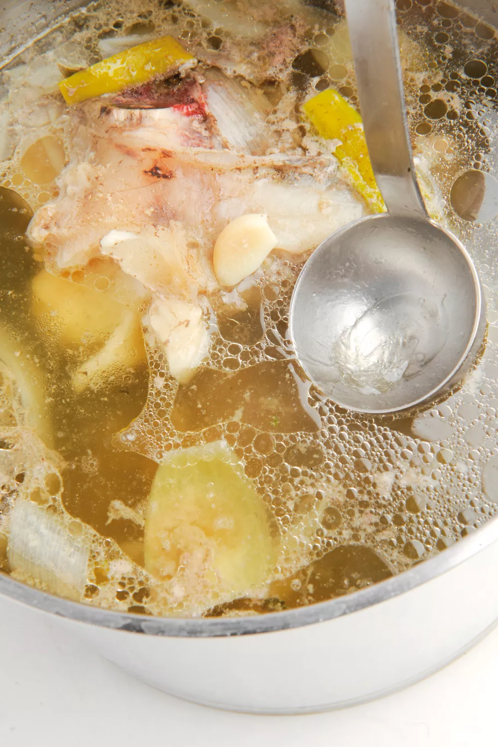 Na het kort doorkoken, neem je met een schuimspaan of lepel het schuim van de fond om een heldere fond te krijgen.