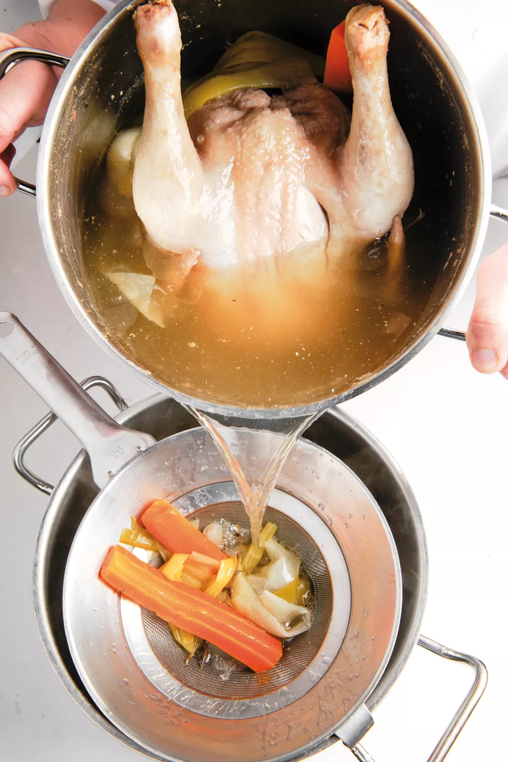 Een krachtige, blanke kippenfond kan je toevoegen als basis voor soepen, bouillons of gerechten als konijn en vol-au-vent. Ook ideaal om groenten in te garen.