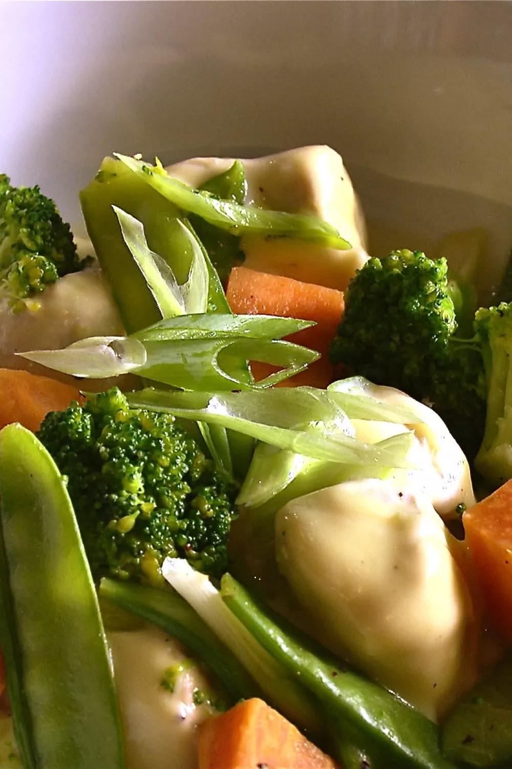 Romige blanquette van kip met zachte stukjes zoete aardappel, knapperige peultjes en broccoli, afgewerkt met frisse limoen, lente-uitjes en bieslook. De kip suddert in geurige kippenfond, de groenten worden geblancheerd en de saus krijgt zijn glans door een blanke roux en een romig eidooiermengsel. Perfect als troostrijk doordeweeks hoofdgerecht in herfst en winter maar fraai genoeg voor een feestelijke tafel.