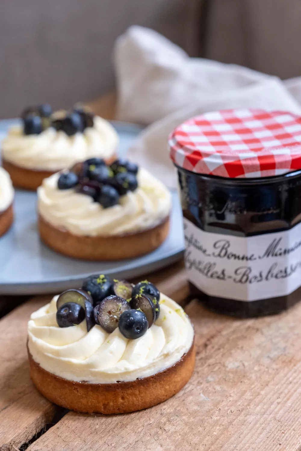 Laat de taartjes afkoelen en lepel er telkens in het midden wat bosbessenconfituur op. Spuit er de crème prise rond. Werk de taartjes nog af met zeste van limoen, extra blauwe bessen en een laagje poedersuiker.