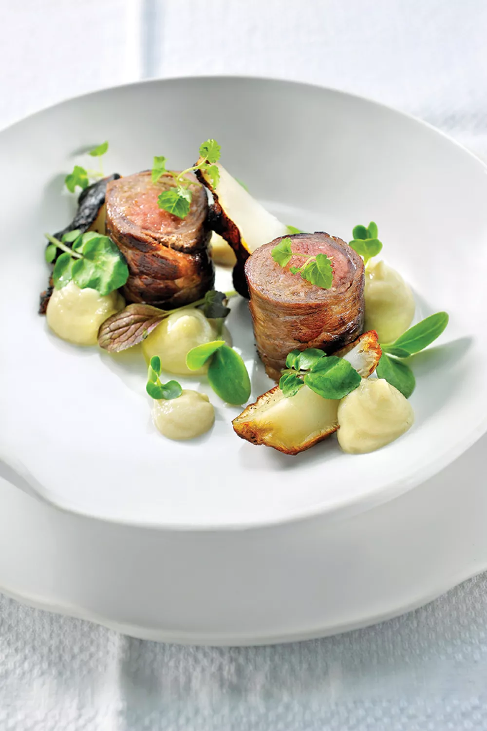 Malse mini blinde vinken van varkenslapjes gevuld met gekruid varkensgehakt, geserveerd met romig aardpeerzalfje en knapperig gebakken aardperen, afgewerkt met frisse postelein. Het vlees wordt kort gebakken in olijfolie met een klont boter waardoor het een warme, nootachtige smaak krijgt die mooi contrasteert met het fluweelachtige zalfje. Ideaal als verwarmend herfst- of wintergerecht voor een gezellig diner.