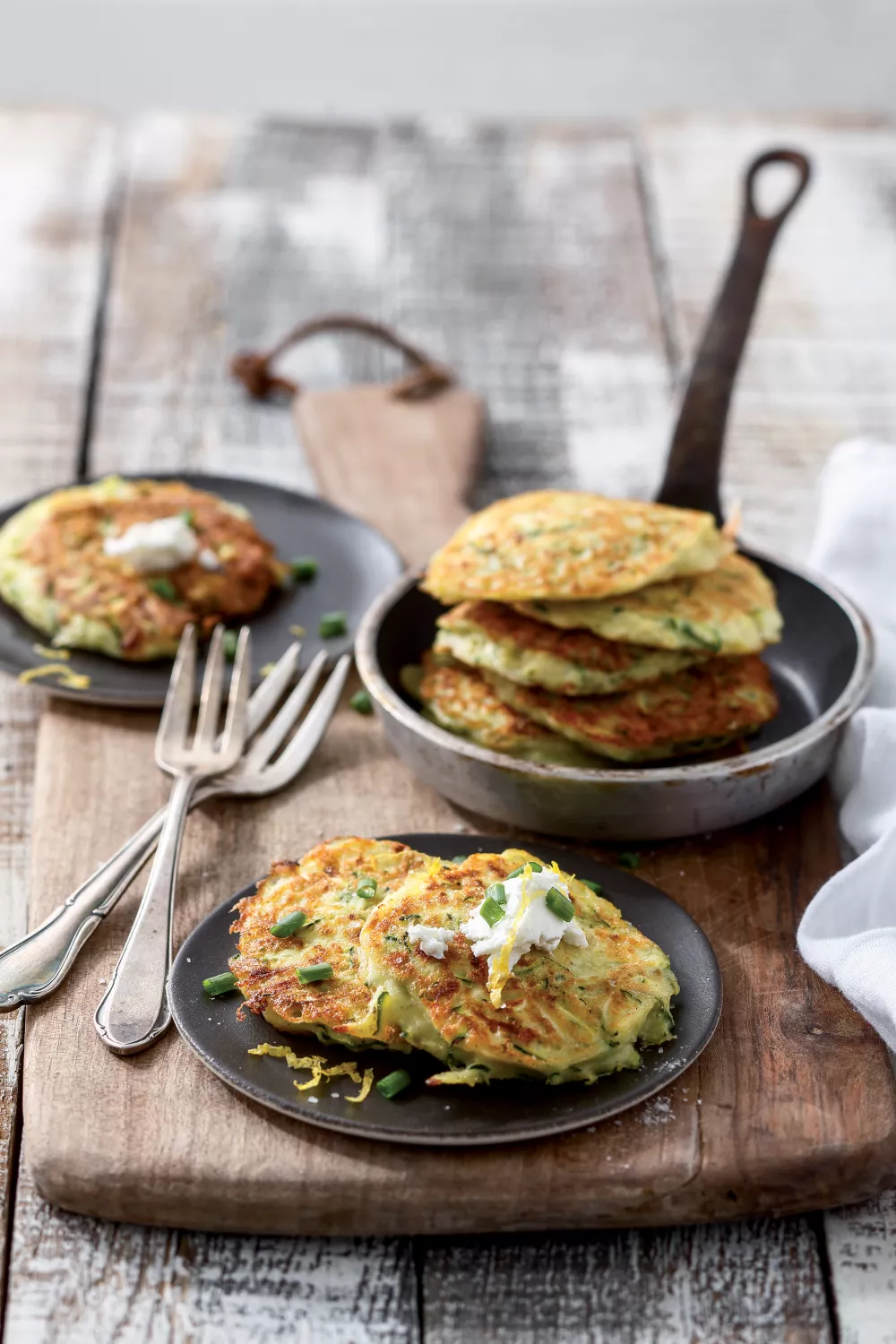 Knapperige courgetteblini’s met romige ricotta en een frisse citroenzeste combineren zomerse smaken met een luchtige, hartige textuur. Met julienne gesneden courgette, eieren en fijn maïsmeel bak je kleine pannenkoekjes in de koekenpan voor een snelle, knapperige bite. Afgewerkt met extra ricotta en bieslook zijn ze perfect als elegant voorgerecht, borrelhap of lichte lunch.