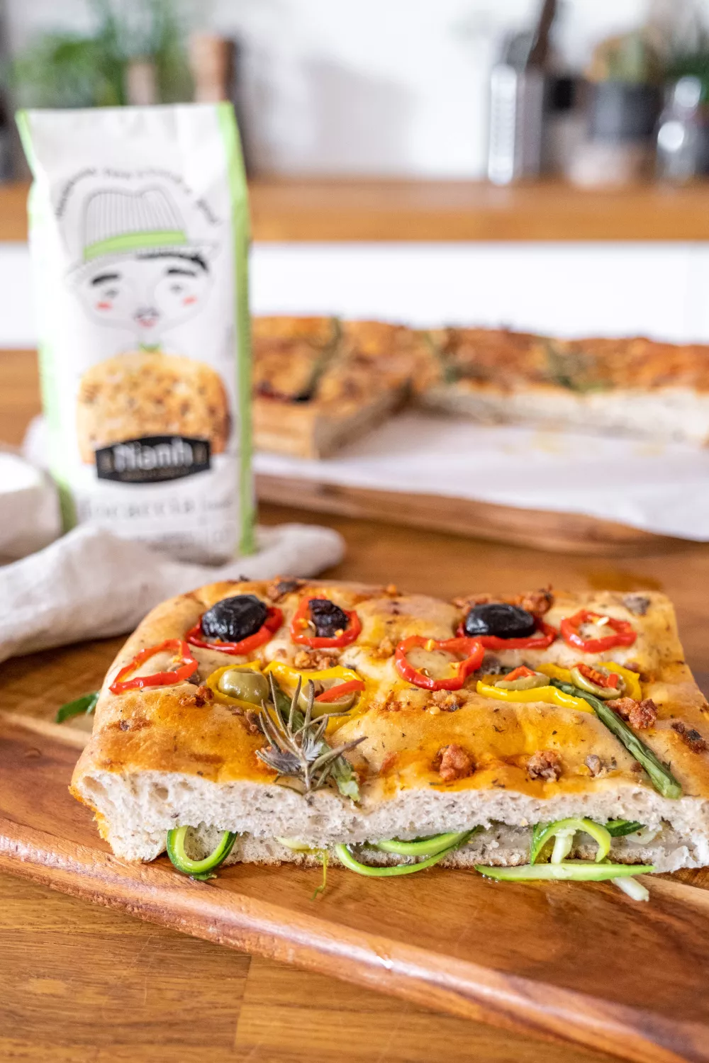 Bak de focaccia 20 minuten in de oven op 215 graden. Laat vervolgens afkoelen en snijd de focaccia horizontaal middendoor. Vul met de courgettespaghetti alvorens te serveren.