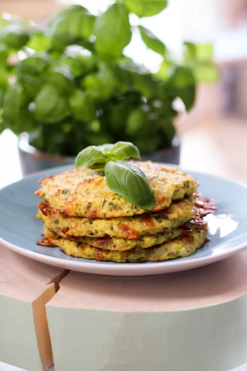 Koel de gegaarde bloemkoolrijst af onder koud, stromend water. Wring vervolgens zo veel mogelijk water uit de bloemkool in de neteldoek. Neem nu een grote kom en meng daarin de bloemkoolrijst met het losgeklopt ei, de blokjes mozzarella, de gegaarde look, de Italiaanse kruiden, peper, zeezout en enkele fijngesneden blaadjes basilicum.
