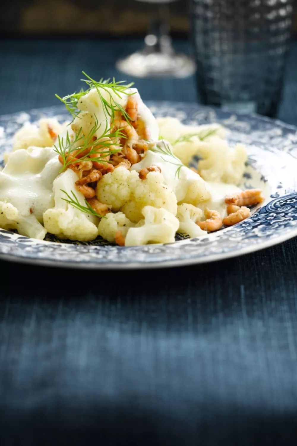 Schep de bloemkool en garnalen op een bord. Spuit of schep er de kaasschuim op en werk af met enkele takjes dille.