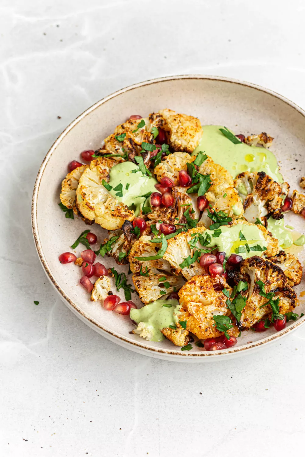 Serveer de geroosterde bloemkool met de granaatappelpitjes en de tahindressing. Werk af met verse munt.