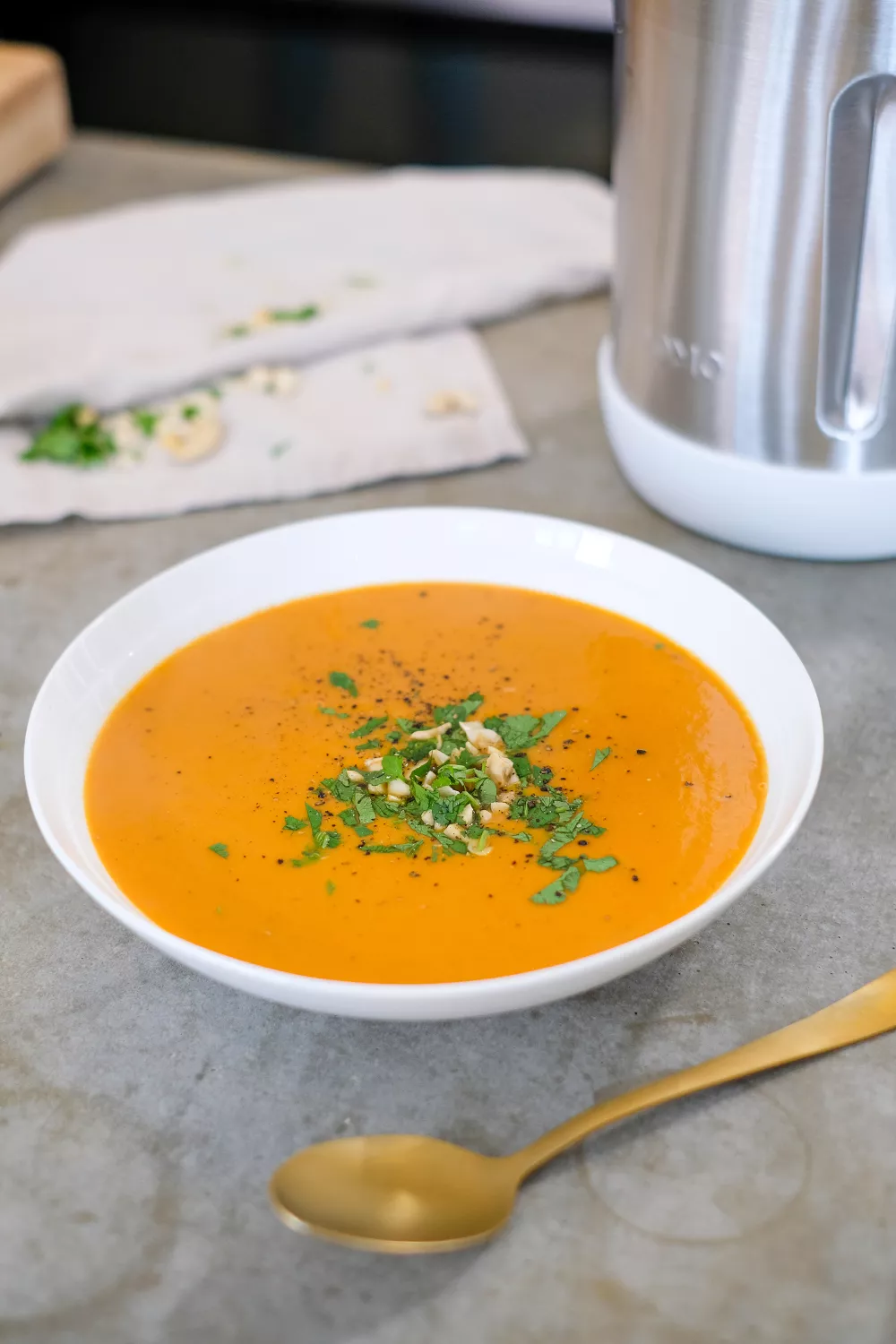 Serveer de soep met geroosterde cashews en verse kruiden.