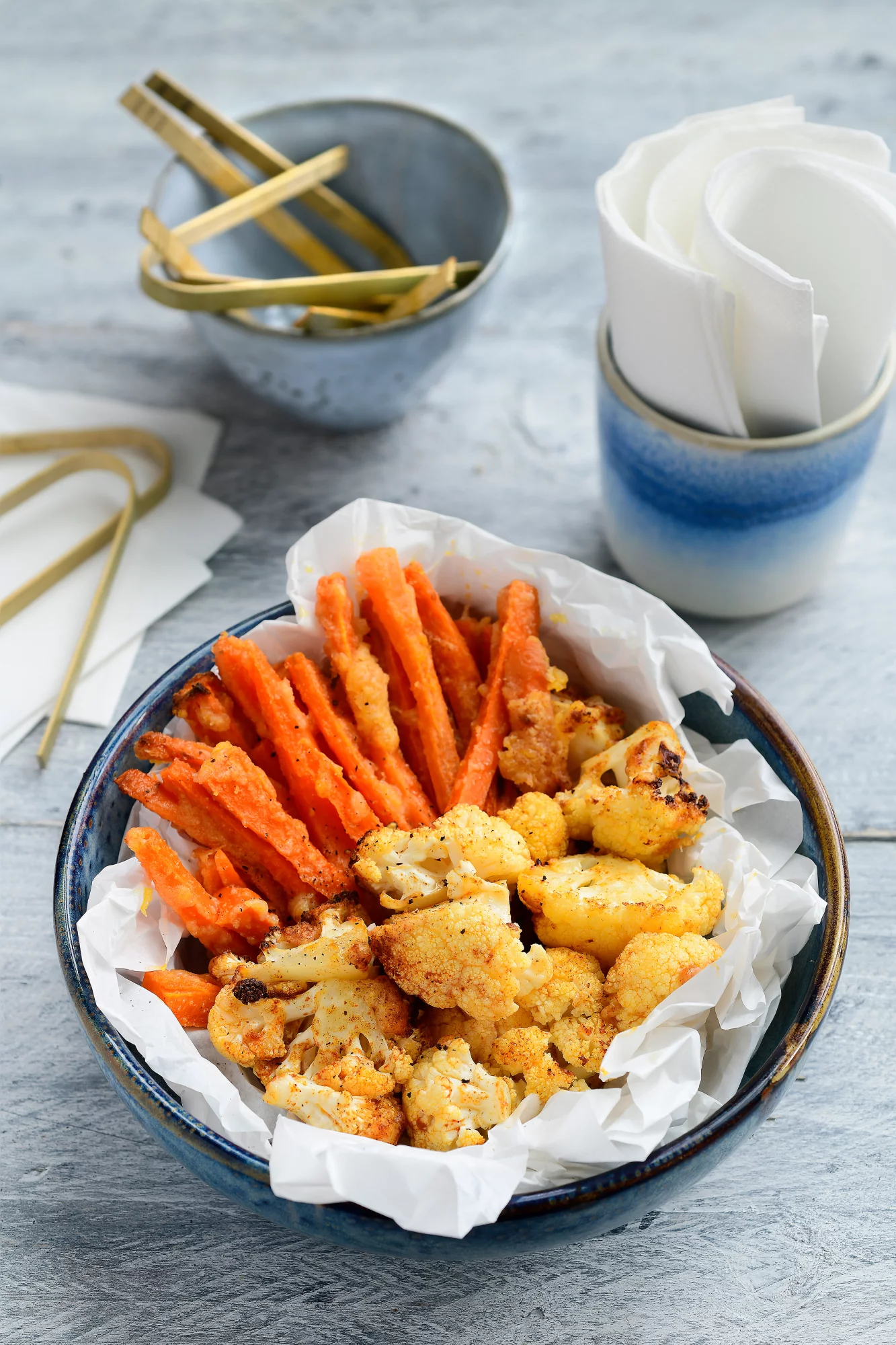 Knapperige bloemkoolbites met gesmolten boter en een hartige korst van Parmezaanse kaas en paprikapoeder, ideaal als vegetarische borrelsnack of warm bijgerecht in de herfst. In de oven worden de roosjes goudbruin en licht pittig, een eenvoudige bereiding die weinig tijd vraagt. Serveer met een frisse dipsaus voor een smaakvol en snel hapje.