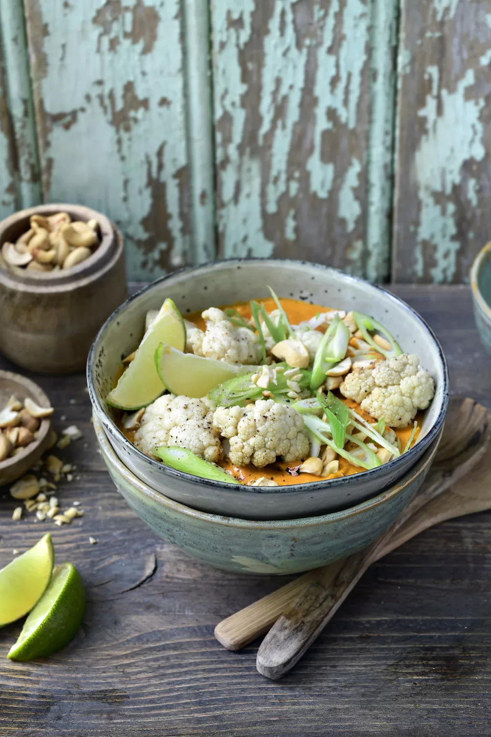 Bloemkoolcurry met romige kokosroom en pittige rode currypasta, afgewerkt met knapperige cashewnoten en een fris partje limoen. De bloemkool wordt eerst geroosterd in de oven en vervolgens kort gesudderd in de kokos currysaus waardoor de smaken mooi intrekken. Een snelle vegetarische doordeweekse maaltijd die comfort brengt bij lente en zomeravonden.