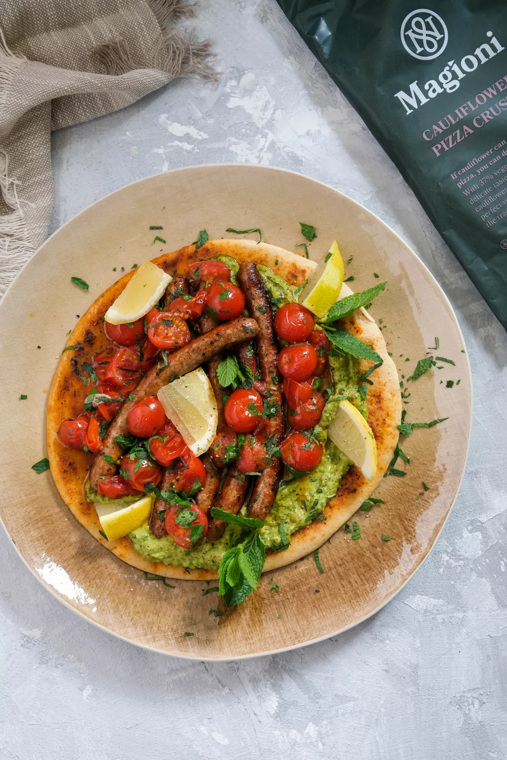Besmeer de pizzabodems met de erwtenhummus. Beleg met de merguezworsten en de tomaatjes. Werk nog af met verse munt en partjes citroen.