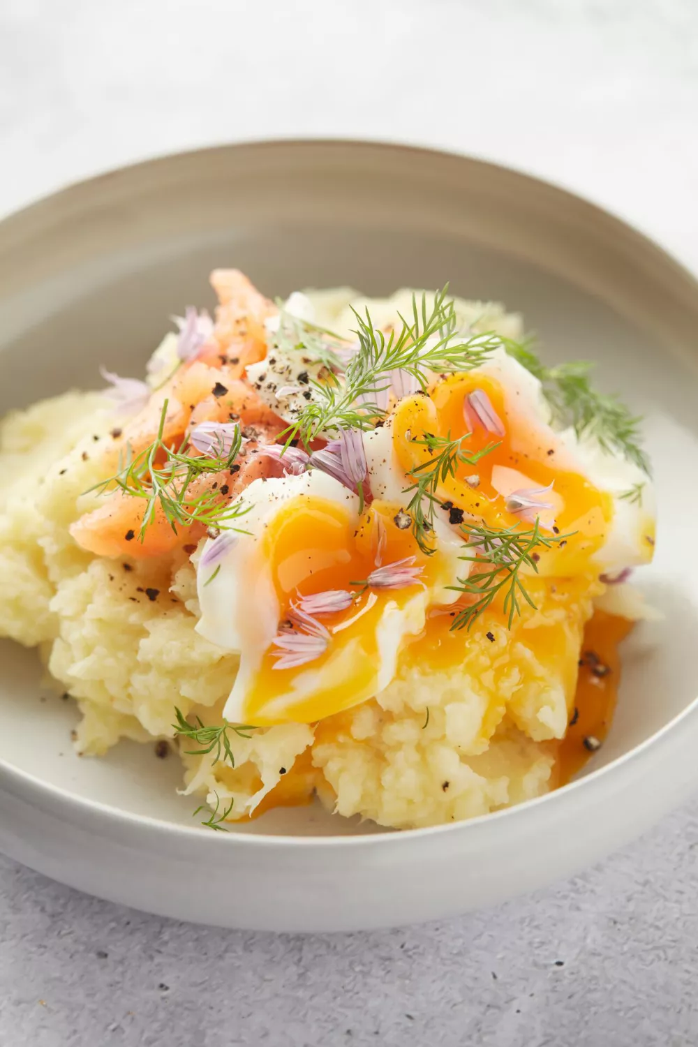 Romige bloemkoolpuree met een zachtgekookt ei en gerookte zalm is een zacht en verfijnd gerecht, ideaal voor een lichte lunch, brunch of feestelijk diner. Aardappelen en bloemkool worden gekookt en gestampt met melk en margarine tot een fluweelzachte puree waarop zoute zalmsnippers en frisse dille en bieslook mooi contrasteren. Snel en eenvoudig te maken, troostrijk op koude winteravonden en fris genoeg voor lente en zomer.