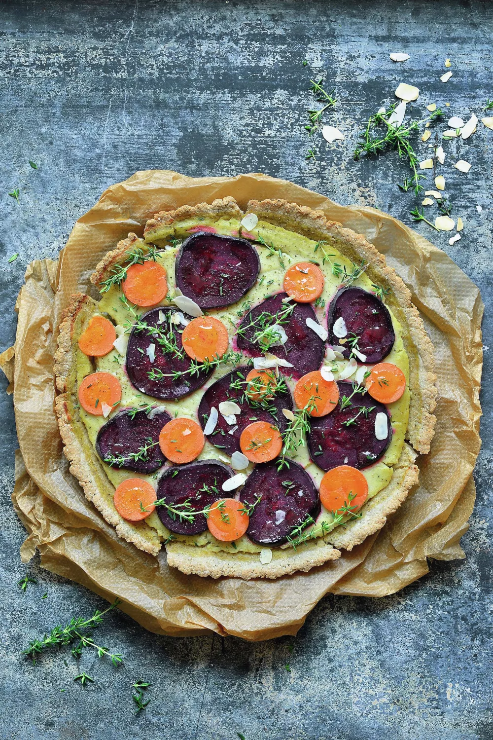 Verwarm de oven voor op 180 graden. Snijd de rode biet en de wortel in superdunne plakjes. Vet ze in met wat olijfolie. Bekleed de quichebodem met de rode biet en de wortels. Zet zo’n 35 à 40 minuten in de oven. Haal uit de oven, laat 15 minuten afkoelen, voeg verse tijm toe. Rooster wat amandelschilfers en strooi ze erover. Serveer met een slaatje.