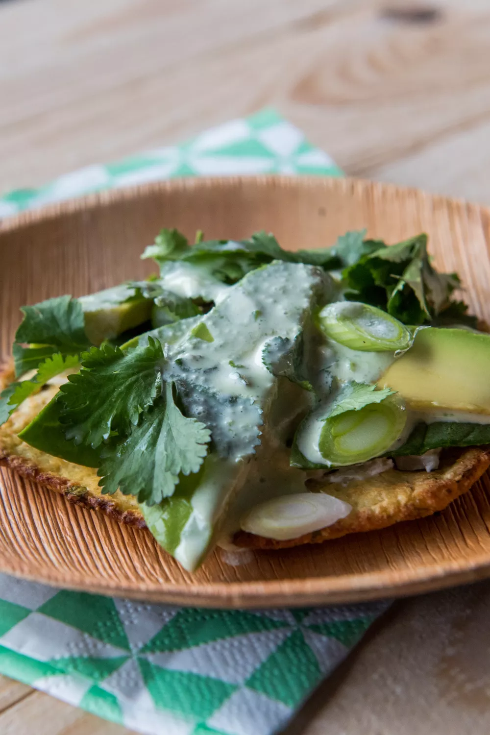 Verdeel de bloemkooltortilla’s over verschillende bordjes. Schik er de koolsla, enkele blaadjes veldsla en enkele blaadjes koriander bovenop. Werk af met de dressing.