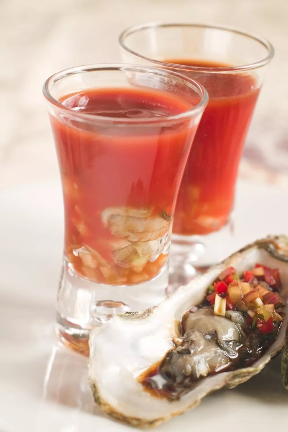 Verdeel de oesters over 6 glaasjes. Top af met het ijskoude tomatensap en serveer samen met een klein shotje Tequila.