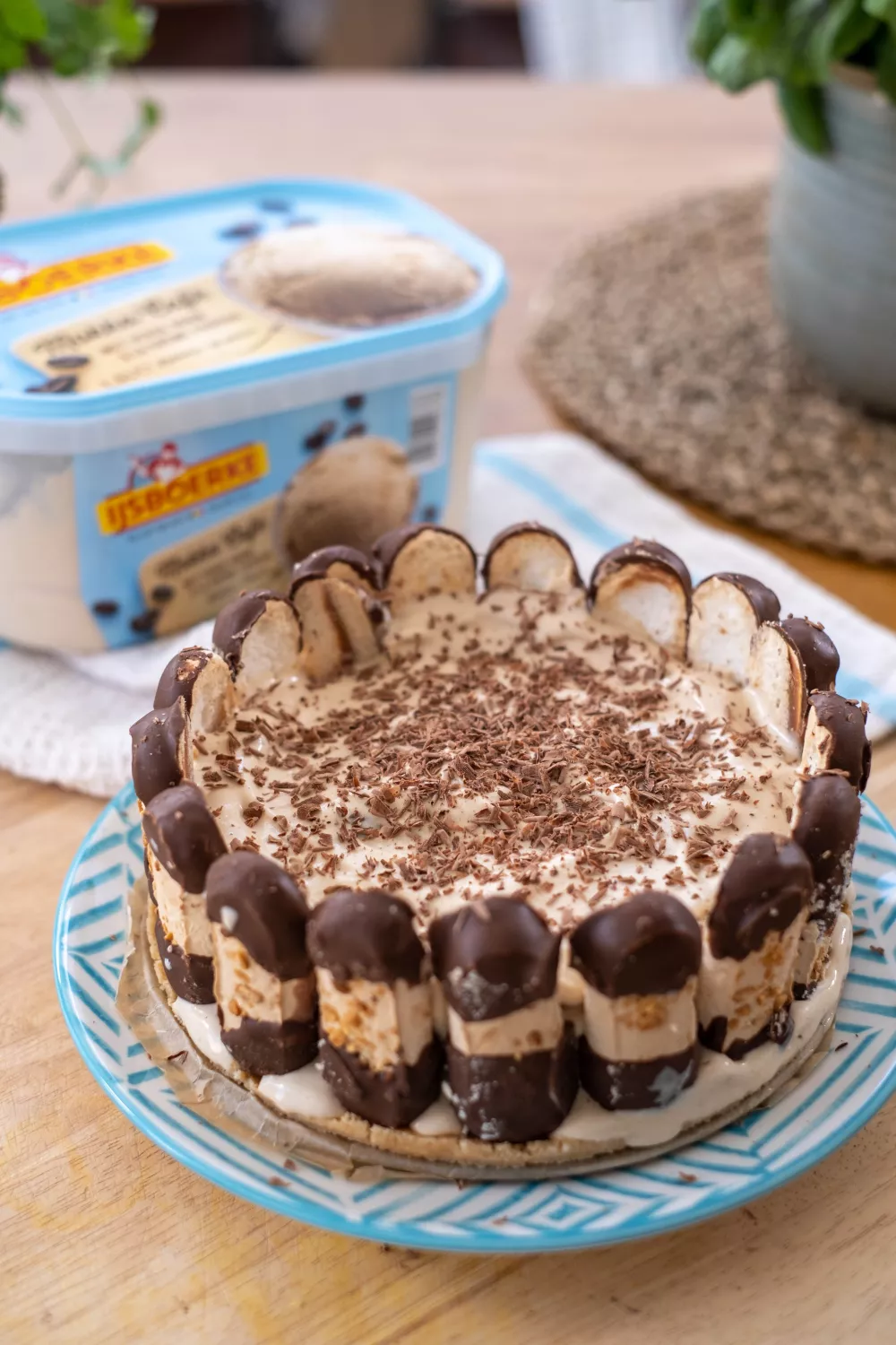 Romige mokka-ijstaart met krokante bokkenpootjes en een boterige zandkoekjesbodem is een onweerstaanbaar dessert voor feestjes of als frisse afsluiter op warme dagen. De rand wordt bekleed met halve bokkenpootjes, de rest wordt fijngehakt en door het ijs geroerd waarna alles in de diepvries uithardt tot een smeuïge, krokante traktatie. Werk af met geraspte pure chocolade voor extra diepte en textuur.