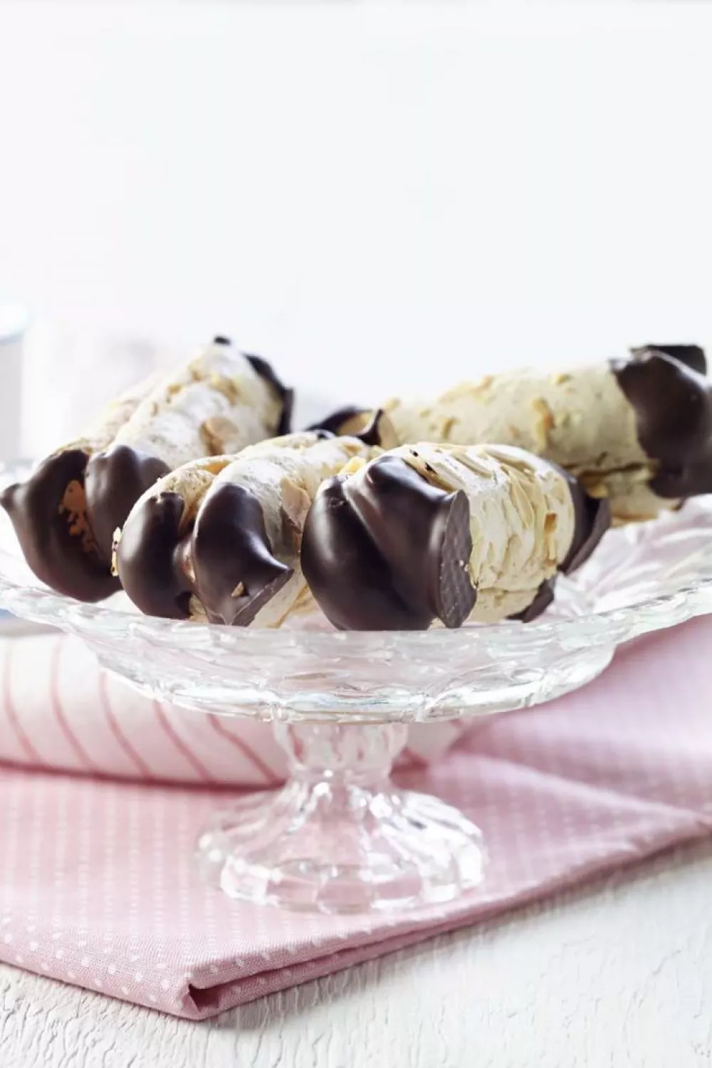 Luchtige bokkenpootjes met knapperige amandelschilfers en een romige koffieroomvulling. Schuimig eiwit en amandelpoeder worden gespoten tot meringueachtige koekjes en gevuld met opgeklopte slagroom op smaak gebracht met sterke koffie. De gedipte pure chocolade au bain marie geeft een elegante touch, perfect als feestelijk dessert of bij de koffie.