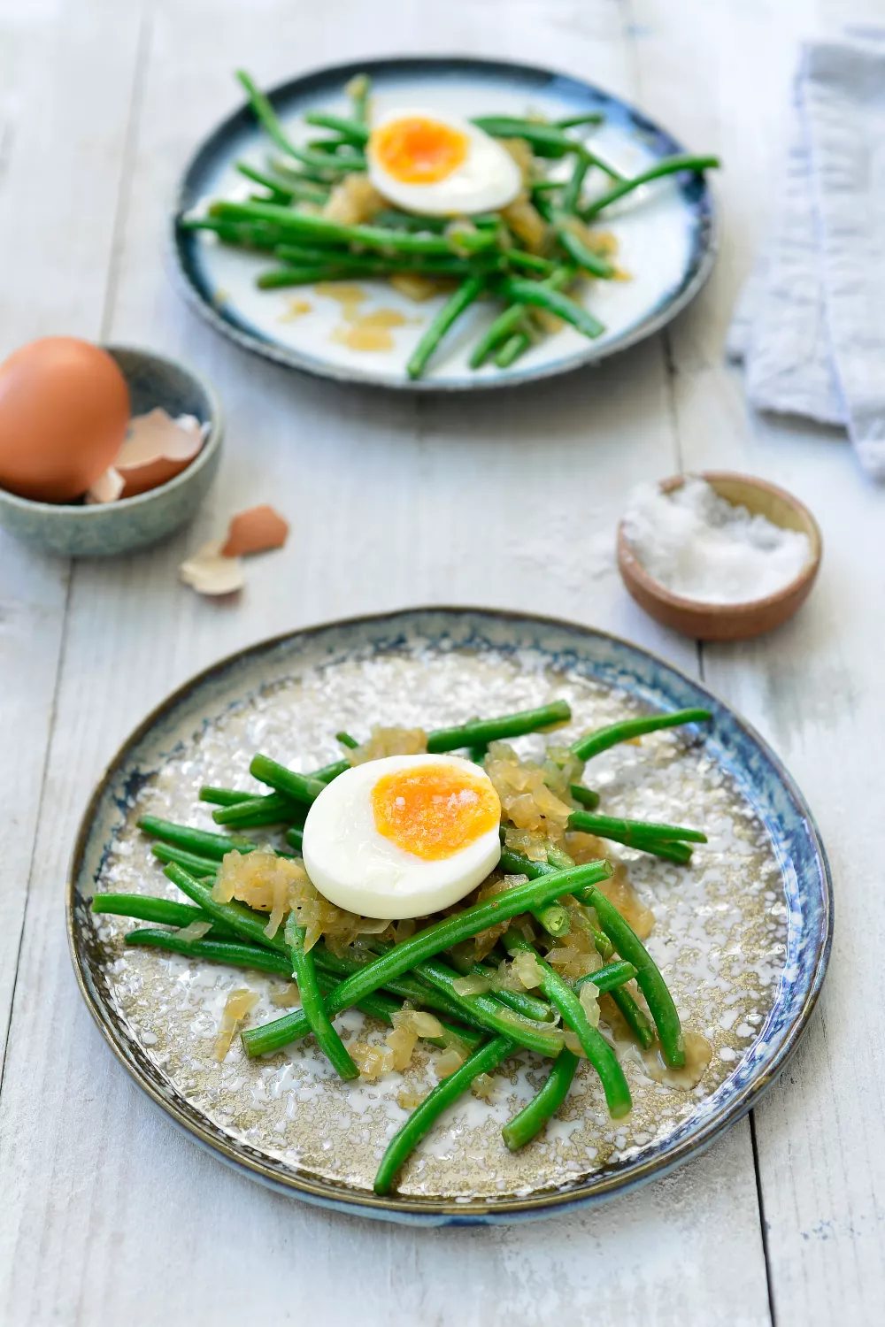 Boontjes met zachtgekookt ei en zure ajuinsaus