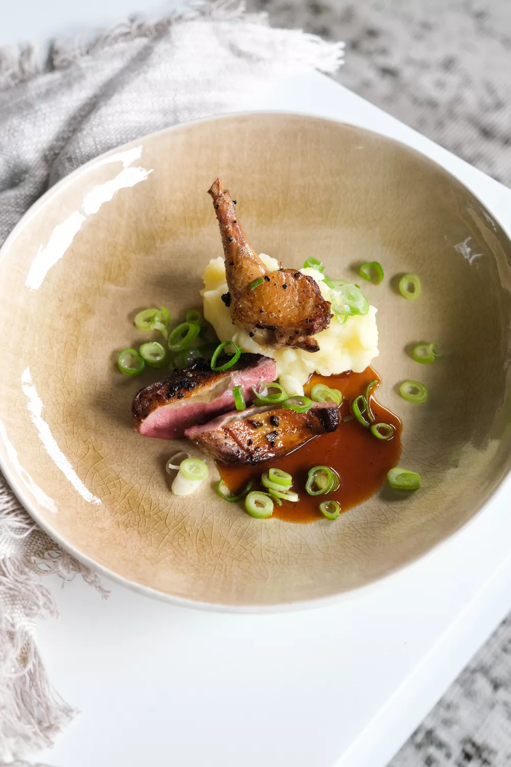 Schep de puree op een bord. Schik er de stukjes duif bovenop. Werk af met de saus en fijngehakte lente-ui.