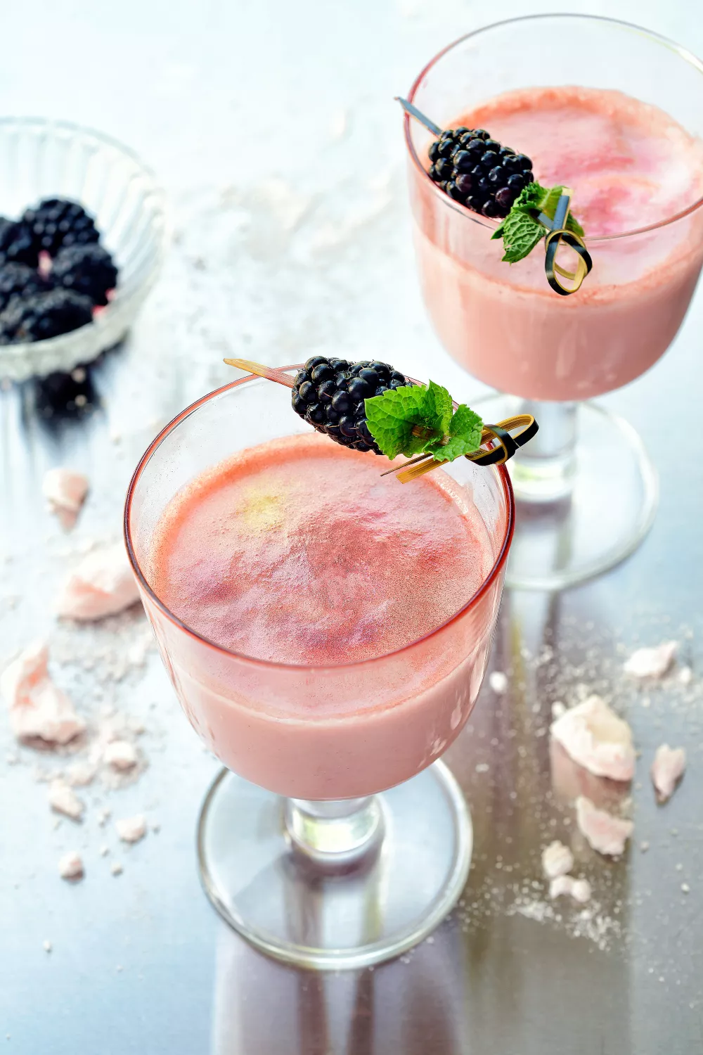 Mix alle ingrediënten voor de sgroppino met een staafmixer of blender tot een romige massa. Schenk de sgroppino in champagneglazen en garneer met de bramen en munt. Voor extra effect kun je er glitterspray op doen.