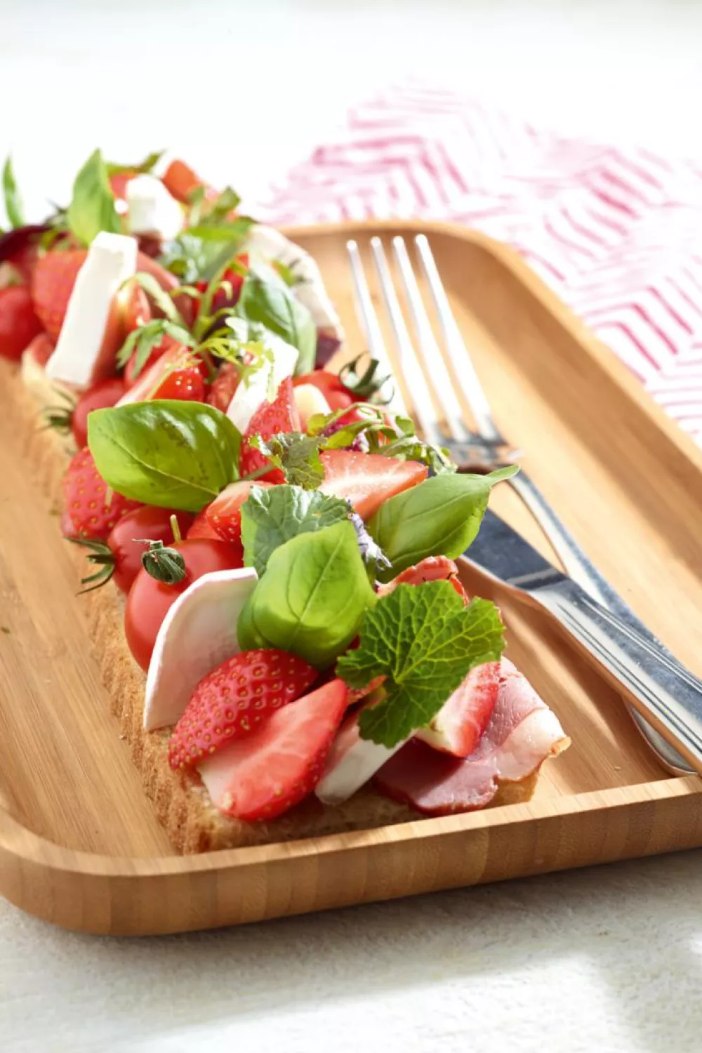 Werk de boterham af met enkele aardbeien, geraspte Parmezaanse kaas en enkele plakjes van de rode biet in zoutkorst.