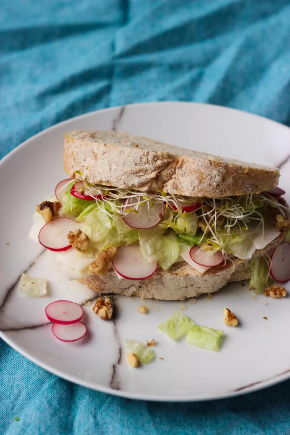 Beleg één helft met de plakjes geitenkaas, ijsbergsla, radijsjes, walnoten en honing. Werk af met enkele scheutjes en bedek met het andere sneetje brood.