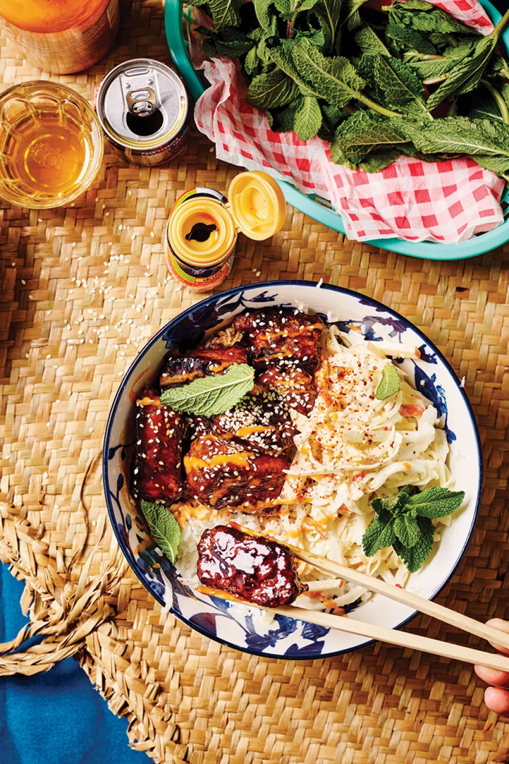 Werk af met sesamzaadjes, munt, chilivlokken en wat sriracha mayonaise.